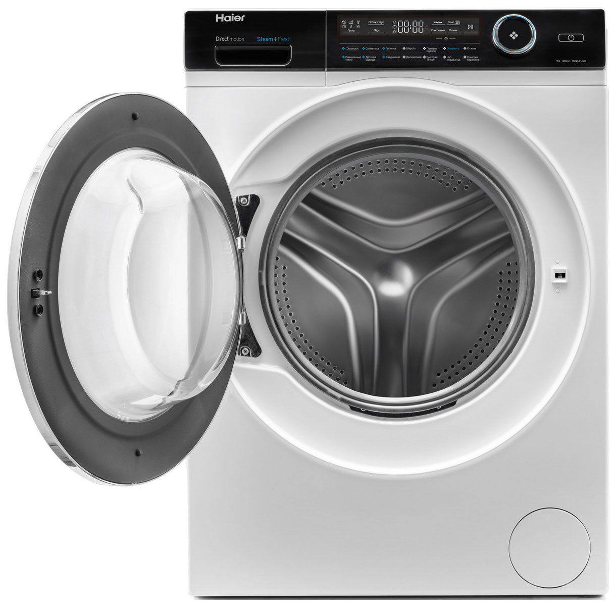 Стиральная машина Haier HW90-B14979 выделяется стильным оформлением и широкими функциональными возможностями. Данная модель предусматривает загрузку до 9 кг белья и оснащена 14 автоматическими программами, среди которых отмечаются функции обработки паром и UV-обработки. На панели управления расположены дисплей, сенсорные кнопки и поворотный механизм.