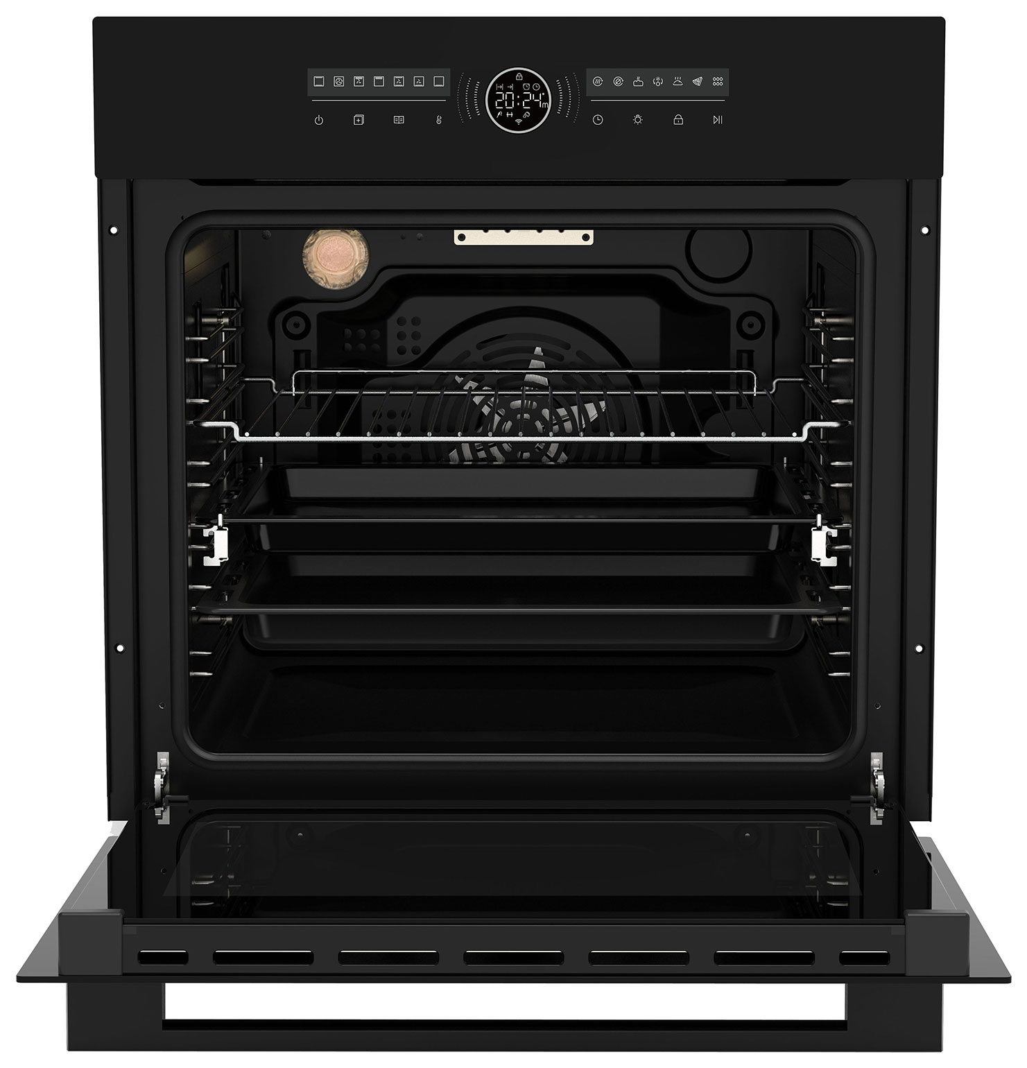 На панели управления духового шкафа Haier HOX-FT5AMTB расположены сенсорные кнопки, центральный поворотный регулятор с LED-дисплеем и динамической подсветкой. Система очистки паром и эмалевое покрытие на стенках упрощают расщепление жира и нагара. Тройное стекло на дверце практически не нагревается с внешней стороны. Телескопические выдвижные направляющие упрощают извлечение противней и решеток.