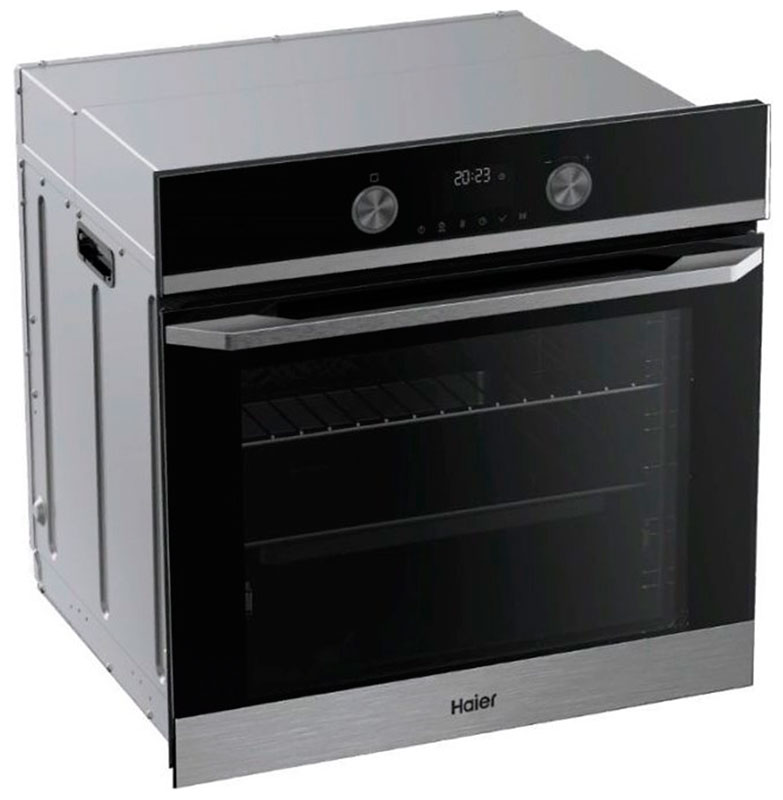 Управление параметрами выполняется при помощи утапливаемых поворотных переключателей и сенсорного дисплея. Три стекла на дверце с теплоотражающим покрытием позволяют ей оставаться прохладной, что повышает безопасность и защищает руки от ожогов. Режим Aquactiva и эмаль легкой очистки помогают устранять загрязнения на внутренних стенках духового шкафа. Для удобства в Haier HOQ-K5AAN3BX реализованы плавное закрывание дверцы и телескопические направляющие.